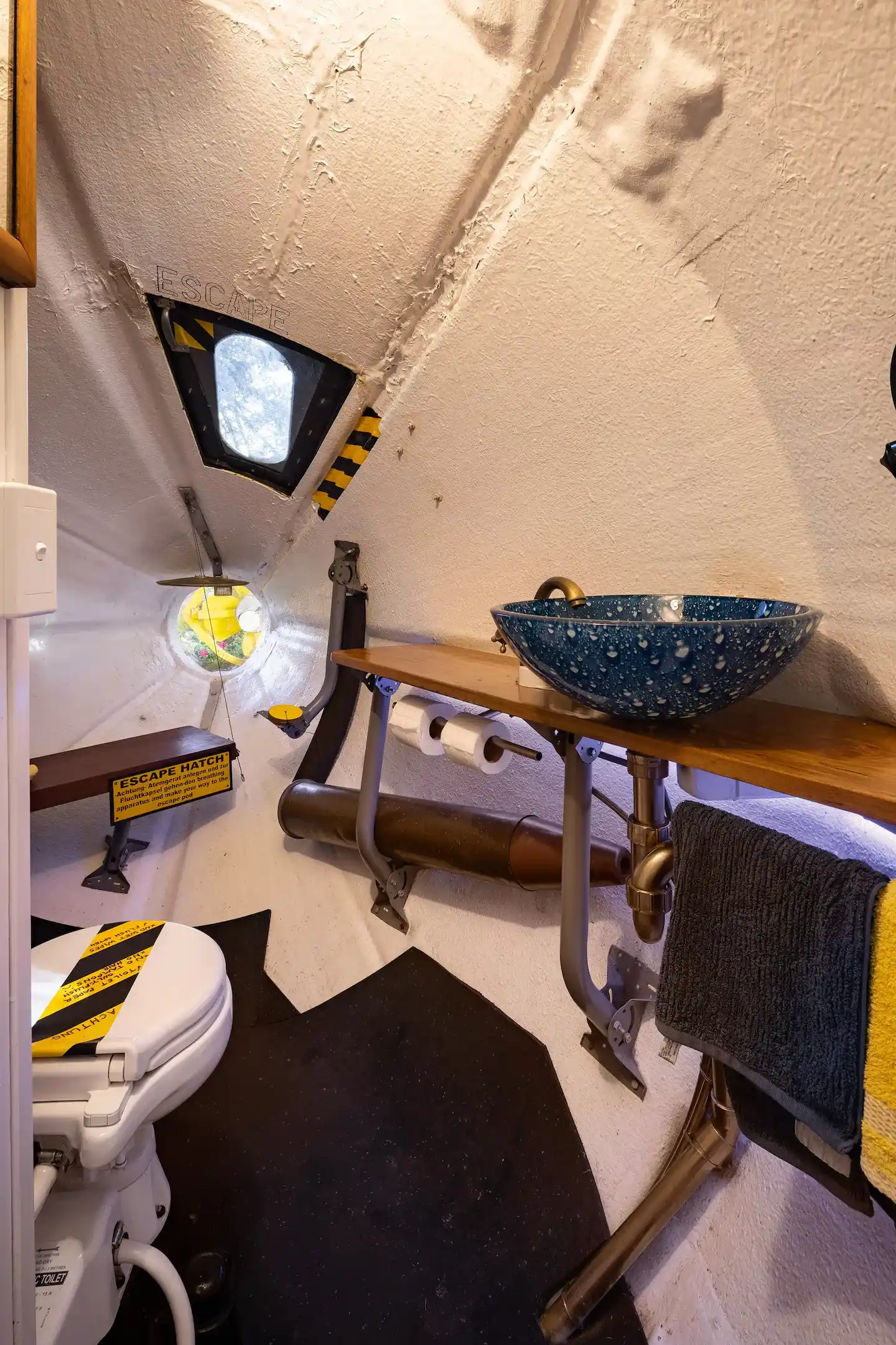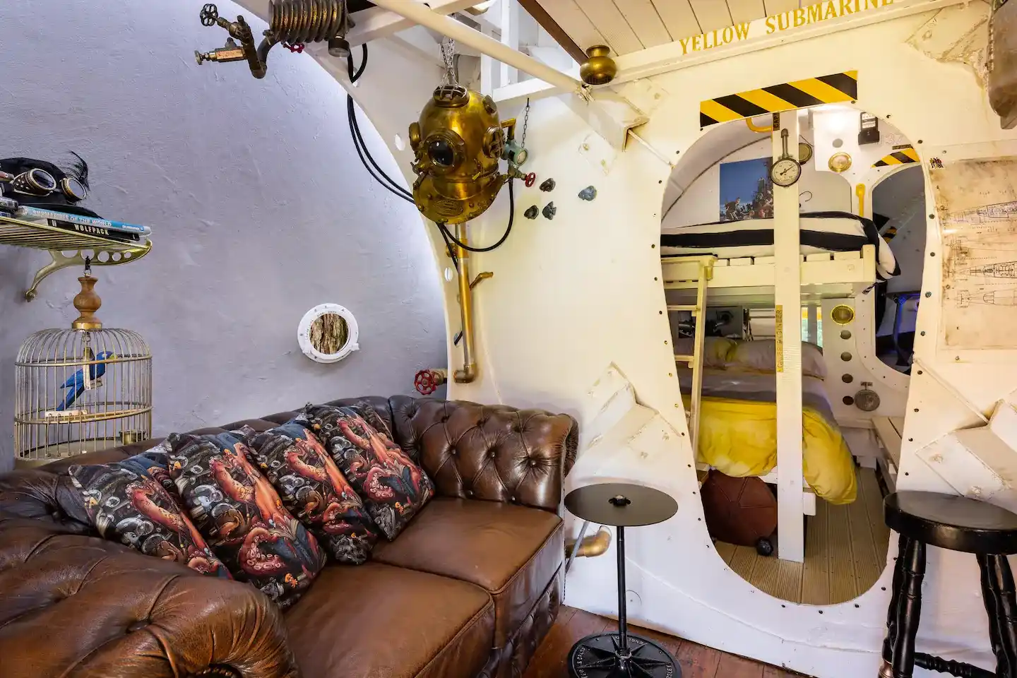 Throughout the Yellow Submarine, you will find those little accents that just feel like you are in a real-life submarine. Things like the warning signs, bulkhead, and of course, the fun old school scuba helmet all play a part in making this a cozy and fun destination.