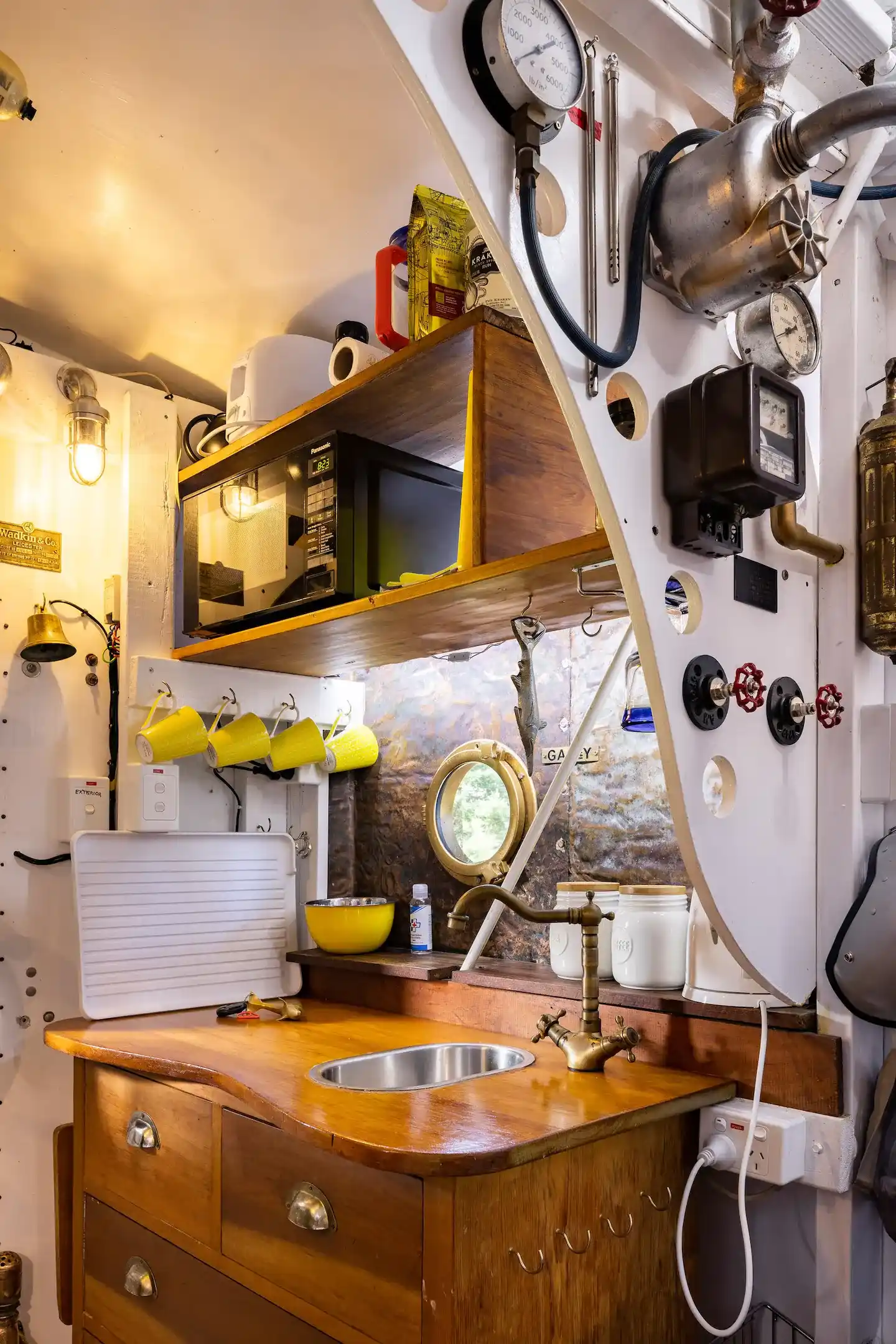 Take note of the nautical touches, such as yellow and black caution tape, a life-sized Beatle mannequin in the corner, fire extinguishers, clocks, thermostats, and an array of exposed pipes.